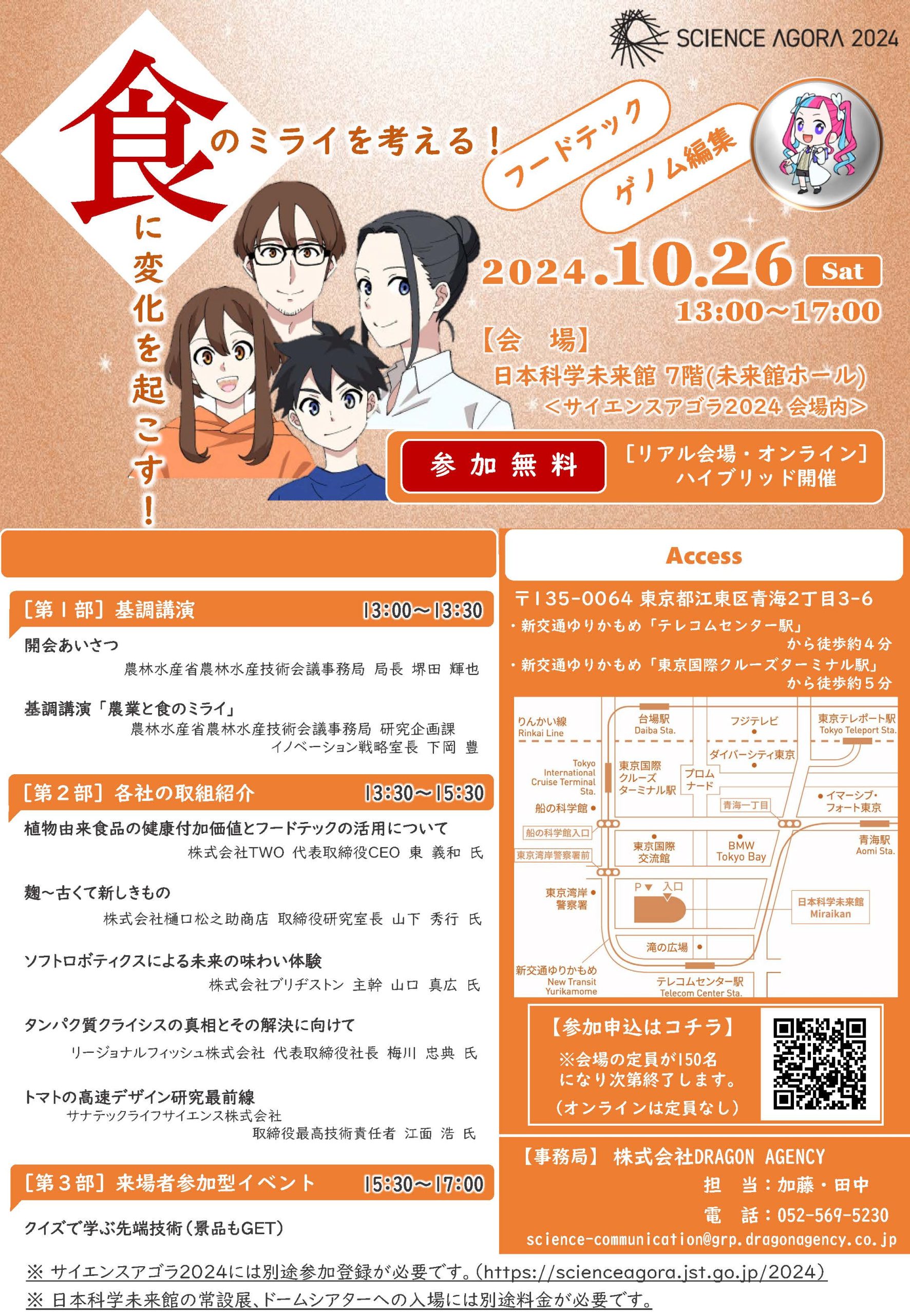 東京お台場のサイエンスアゴラ会場において、フードテックやゲノム編集の分野で活躍されている企業の方々をお招きし、各社の取組紹介など、皆さんと一緒に『食のミライ』を考えるイベントを開催します。
