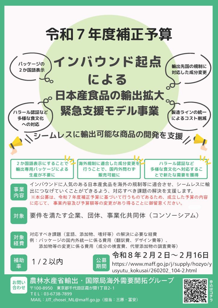 農林水産省「令和7年度インバウンド起点による日本産食品の輸出拡大緊急支援モデル事業の公募について(令和7年度補正予算)」