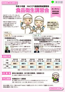 東京都福祉保健局より、令和5年度HACCP推進者育成講習会(オンライン・無料)のご案内をいただきました。