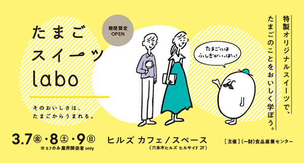 当センターは、たまごのおいしさと魅力を知っていただくために「たまごスイーツlabo そのおいしさは、たまごからうまれる。」を2025年3月7日から9日の3日間(7日業界関係者向け、8・9日一般来場者向け)、六本木ヒルズ カフェ/スペースにて開催します。鶏卵の消費促進を目的としており、「乾燥卵(粉卵)」を活用した人気パティシエによるオリジナルスイーツの実食体験や、たまごについて楽しく学べるトークショーや展示で、たまごのおいしさと魅力を再発見してください。